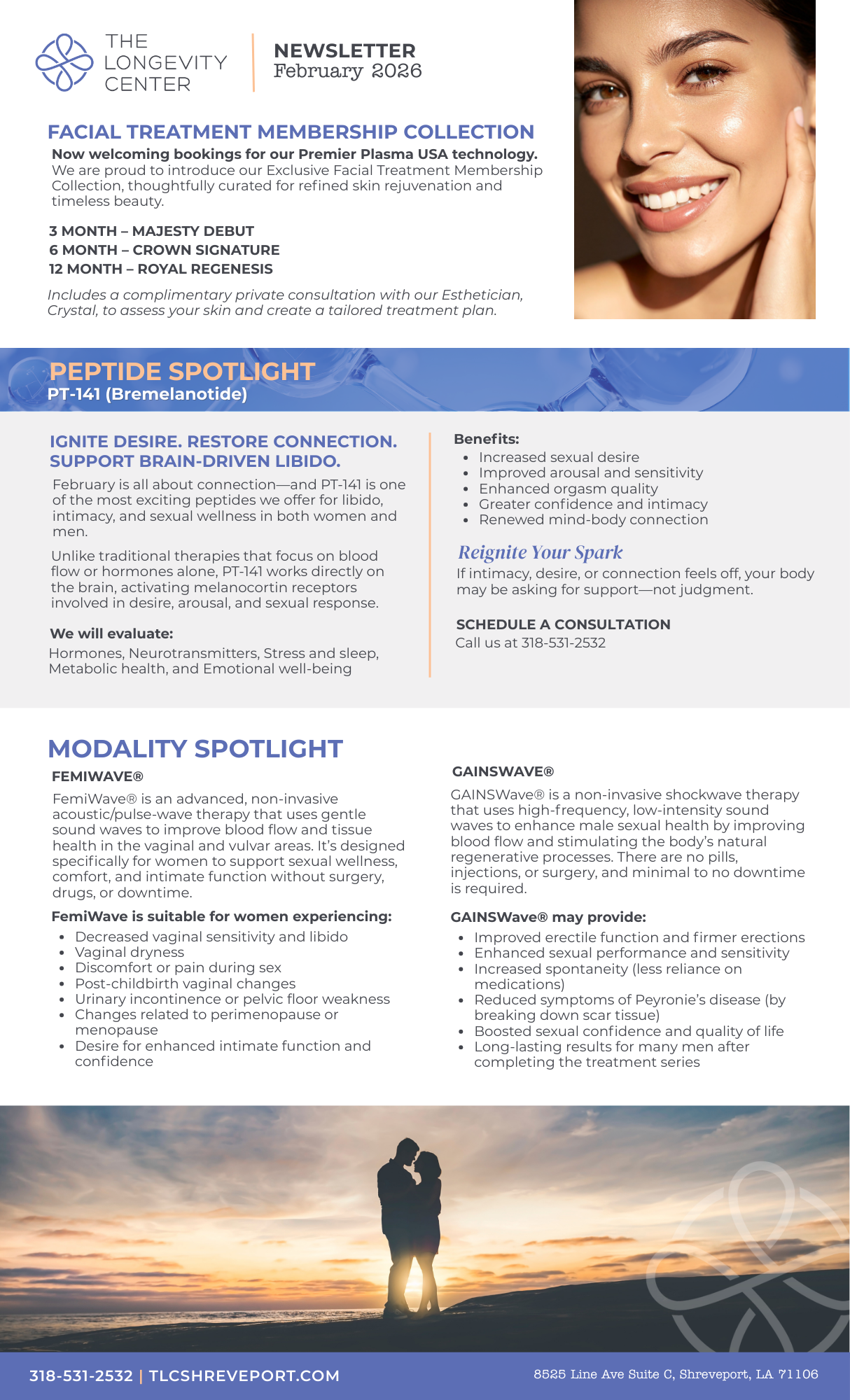 This February, TLC is all about connection and wellness with peptides, FemiWave®, and GAINSWave®. We are thrilled to introduce Plasma Facial Treatment memberships with our esthetician, Crystal. Let’s get healthy together!