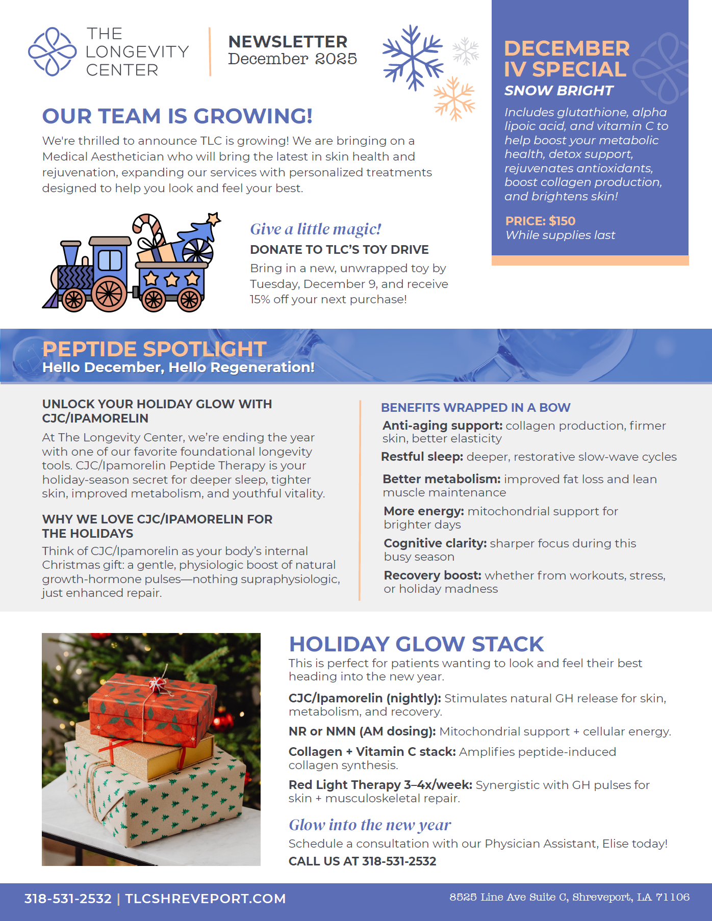At The Longevity Center, we believe staying strong, energized, and resilient shouldn't be left to chance. That’s why we offer therapies that help you take control of your health—supporting vitality, recovery, and longevity every step of the way.